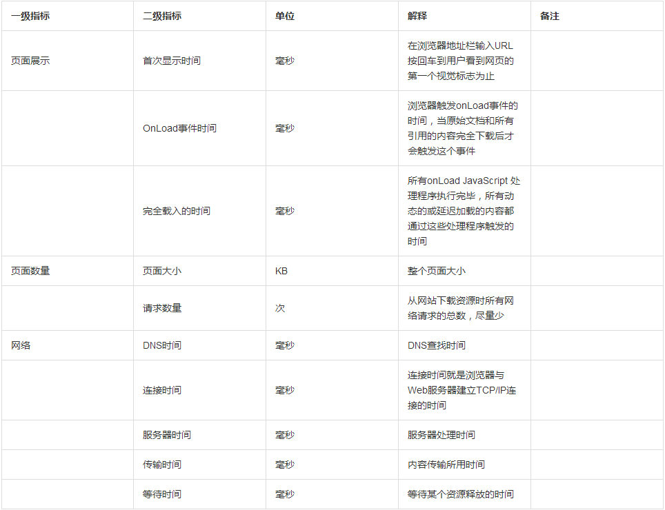 前端指标主要包括页面展示和网络所花的时间,具体如下: